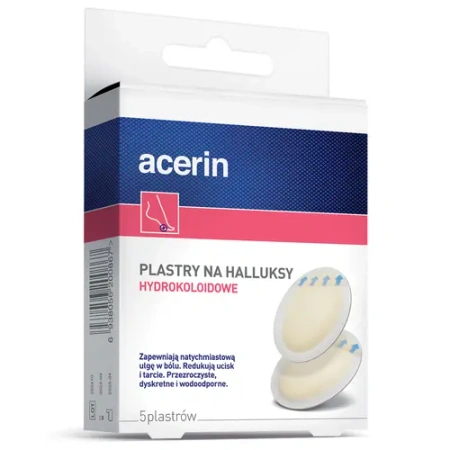 - Acerin Plastry na halluksy to dyskretne plastry hydrokoloidowe, które działają jak ochronna „druga skóra”, natychmiastowo łagodząc ból i nacisk obuwia. Dzięki wodoodpornej formule skutecznie chronią wrażliwe miejsce przed otarciami.