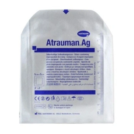 - Atrauman AG 5x5 cm to jałowy opatrunek z maścią i srebrem, do leczenia zainfekowanych i trudno gojących się ran, takich jak owrzodzenia żylne, stopa cukrzycowa, odleżyny, oparzenia II stopnia.