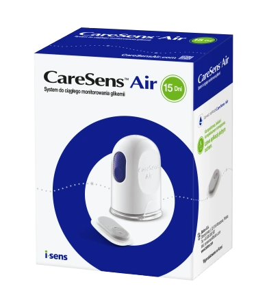 CareSens Air to system do ciągłego monitorowania glikemii, który przez 15 dni użytkowania pozwala w łatwy i wygodny sposób śledzić poziom glukozy. System wysyła dane na telefon pacjenta co 5 minut, umożliwiając obserwację trendów i tempa zmian stężenia glukozy w czasie rzeczywistym. Konstrukcja 3 w 1 (sensor, transmiter i aplikator) umożliwia łatwe i szybkie założenie urządzenia jednym ruchem, bez konieczności montażu poszczególnych elementów. Dzięki aplikacji CareSens Air możliwe jest monitorowanie wpływu odżywiania i aktywności fizycznej na poziom glikemii.