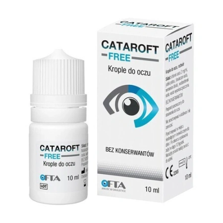 Cataroft Free to wyrób medyczny w postaci izotonicznego roztworu do oczu o właściwościach nawilżających. Preparat zawiera jodek potasu, który poprzez wychwytywanie wolnych rodników wspomaga procesy wchłaniania wysięków i krwotoków w obrębie oka. Produkt przeznaczony jest do profilaktyki zmętnień soczewki oraz ciała szklistego oka. Nie zawiera konserwantów, dzięki czemu jest odpowiedni do długotrwałego stosowania.