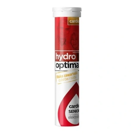 Hydrooptima Senior Cardio to suplement diety w postaci tabletek musujących zawierający glukozę, elektrolity oraz wyciągi roślinne z pestek winogron, głogu i skrzypu polnego. Preparat przeznaczony jest dla osób dorosłych, szczególnie seniorów.