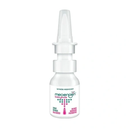 - Medenosin Baby Kids Spray dla dzieci powyżej 2. roku życia, który służy do oczyszczania i nawilżania błony śluzowej nosa podczas przeziębienia i kataru. Zawiera izotoniczny roztwór soli i postbiotyk morski Symbiofilm.