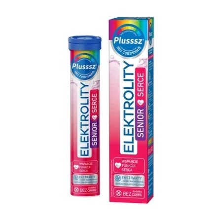 Plusssz Elektrolity Senior Serce – suplement diety w postaci tabletek musujących, zawierający elektrolity, witaminę C, tiaminę, ekstrakty roślinne oraz koenzym Q10. Produkt przeznaczony dla osób dorosłych, wspierający prawidłowe funkcjonowanie serca, krążenie krwi oraz równowagę elektrolitową.