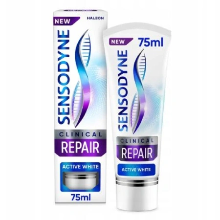 SENSODYNE Clinic Repair Active White to pasta do zębów przeznaczona dla osób z nadwrażliwością zębów, która zaczyna odbudowywać uszkodzone obszary zębiny już w ciągu 2 minut od zastosowania. Formuła z technologią NOVAMIN tworzy ochronną warstwę mineralną na powierzchni zębów, zapewniając szybką oraz długotrwałą ulgę w nadwrażliwości. Pasta jednocześnie pomaga zachować naturalną biel zębów oraz skutecznie usuwa osady, zapewniając do 32% skuteczniejsze czyszczenie w porównaniu z pastami innych marek. Orzeźwiająca mieszanka mięty pieprzowej i zielonej zapewnia długotrwałe uczucie świeżości, a bogata piana i wyjątkowy smak uprzyjemniają codzienną higienę jamy ustnej.